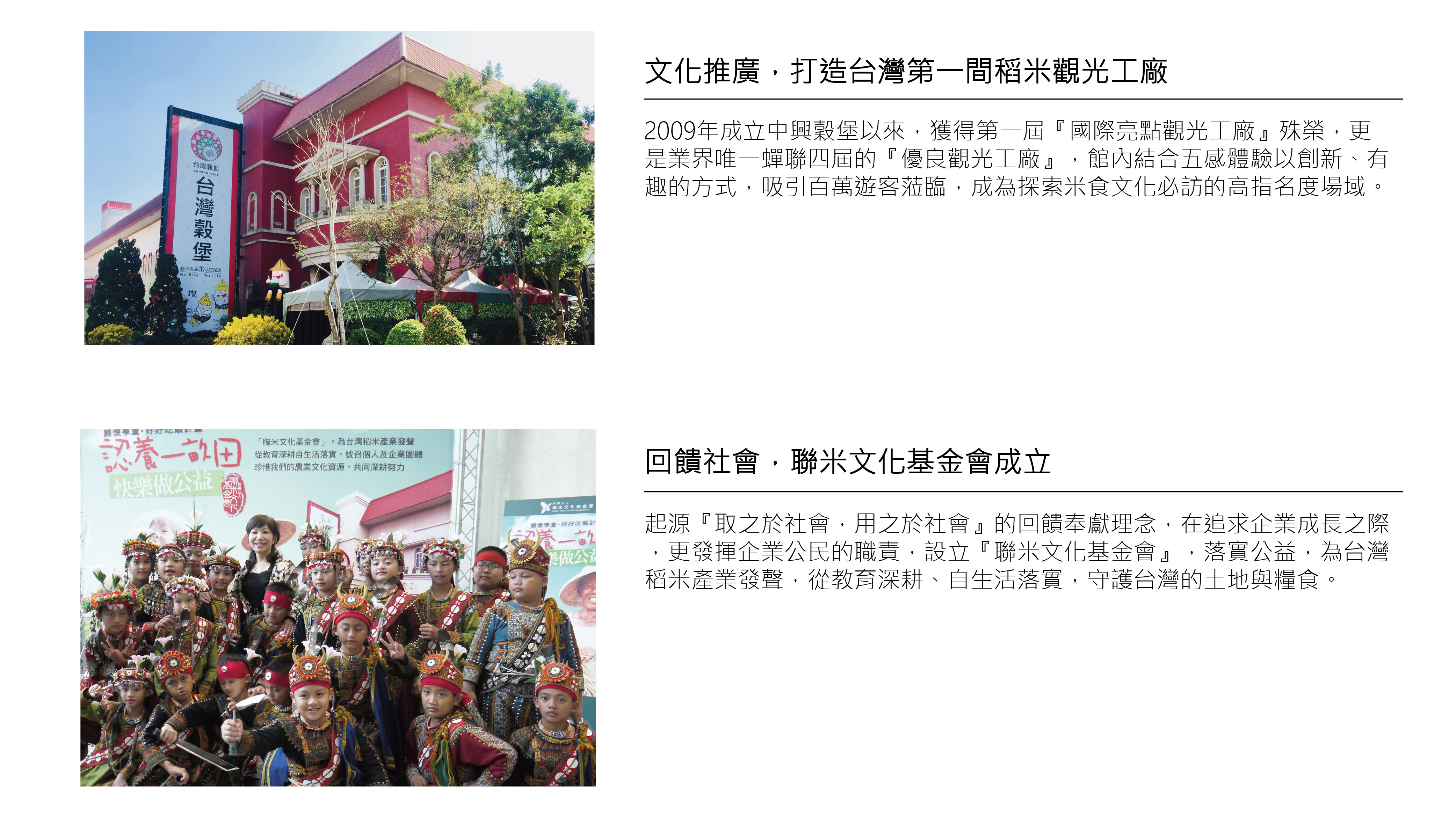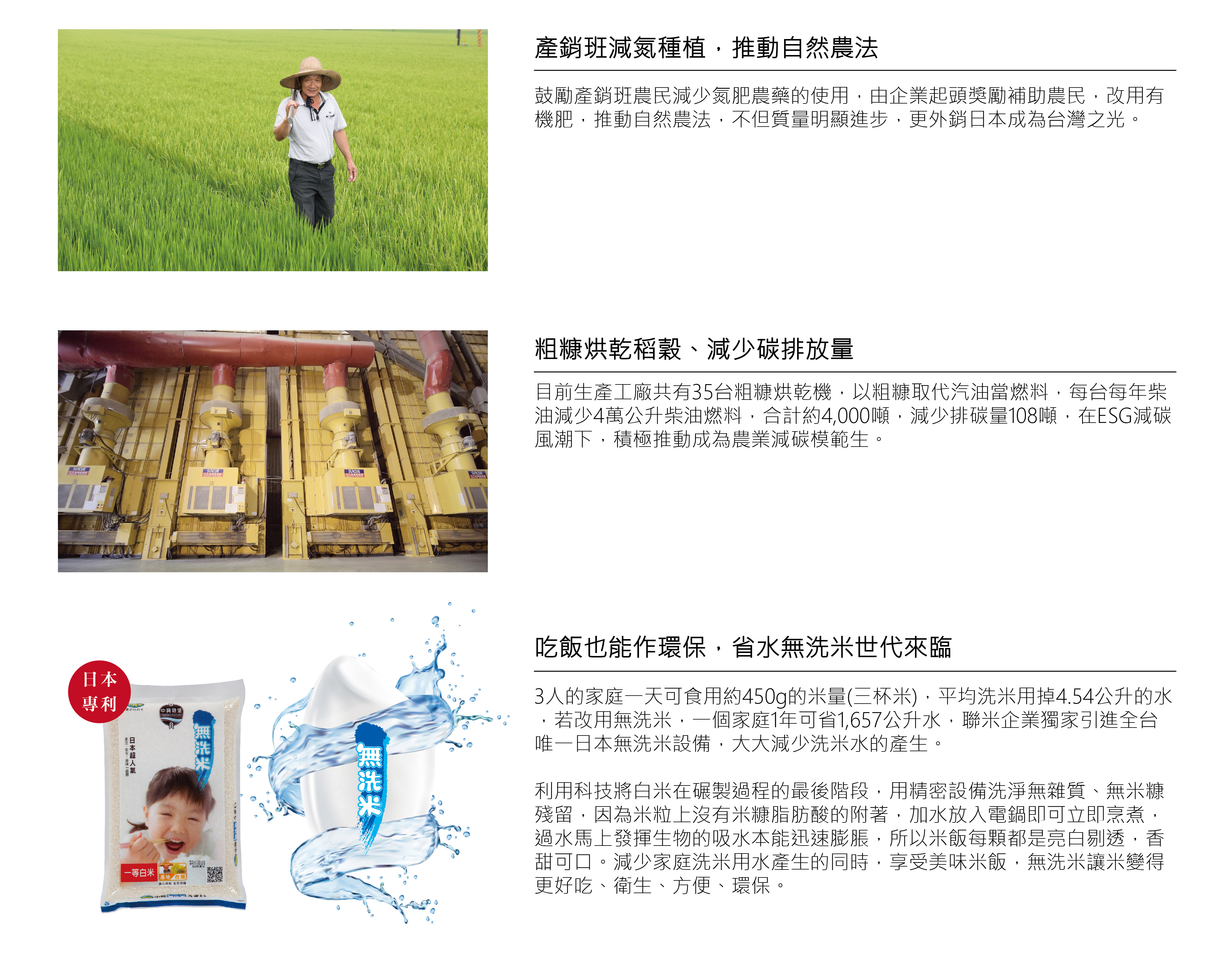 良田種好米,福田種健康,聯米企業除了照顧消費者吃得健康,長期投入多項CSR企業社會責任,從推廣『減氮無毒栽種、減碳排放、環保省水無洗米推出、公益基金會成立、米食文化推廣』都可看到顯著的成績,領先業界成為綠色環保企業。