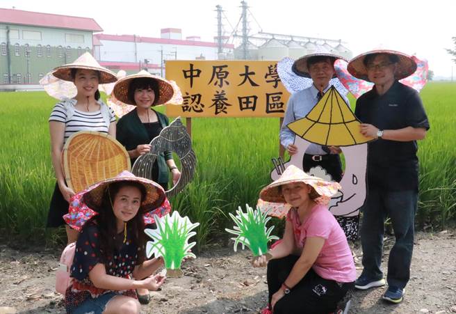 中原大學副校長李英明與聯米文化基金會董事長莊麗珠等人在認養田前開心合影。(鐘武達攝)